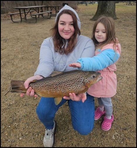 Jessica was excited to catch this large brown trout casting a spoon at Wallace Lake (photo courtesy of James Krasula).
